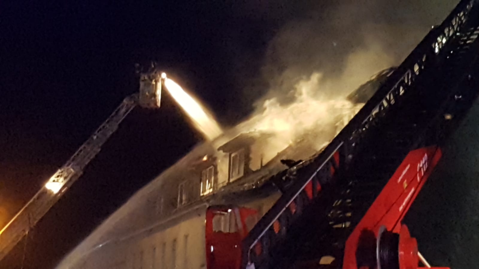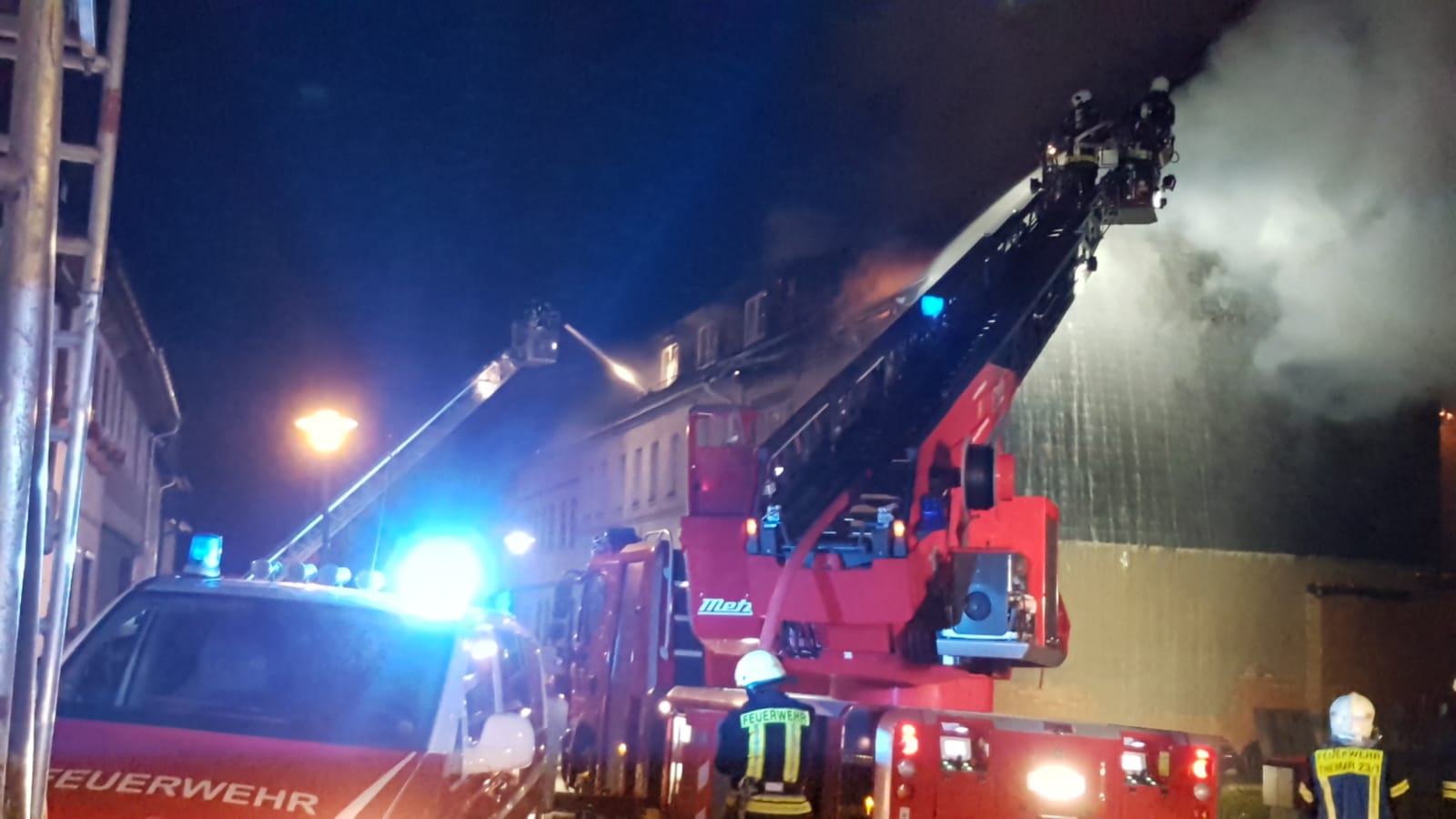 Gegen halb neun am Mittwochabend war das Feuer in dem Reihenhaus in der Thälmannstraße ausgebrochen - im Bereich des Dachstuhls, wie ein Polizeisprecher sagte. Demnach konnten alle 8 Bewohner und 7 weitere Bewohner eines Nachbarhauses unverletzt aus den Gebäuden. Die Flammen griffen ausserdem noch auf ein leerstehendes Haus über. Der Schaden wird auf rund 250tausend Euro geschätzt. Der Löscheinsatz läuft im Moment noch.